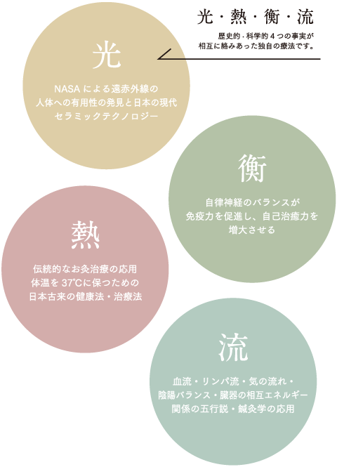 自己治癒力を上げるカギは、心の持ち方と気血のめぐりにあるといわれ、遠赤外線(8〜15ミクロンの波長)は、私達の健康な時の気(生命力)の波長と同じであることがわかっています。